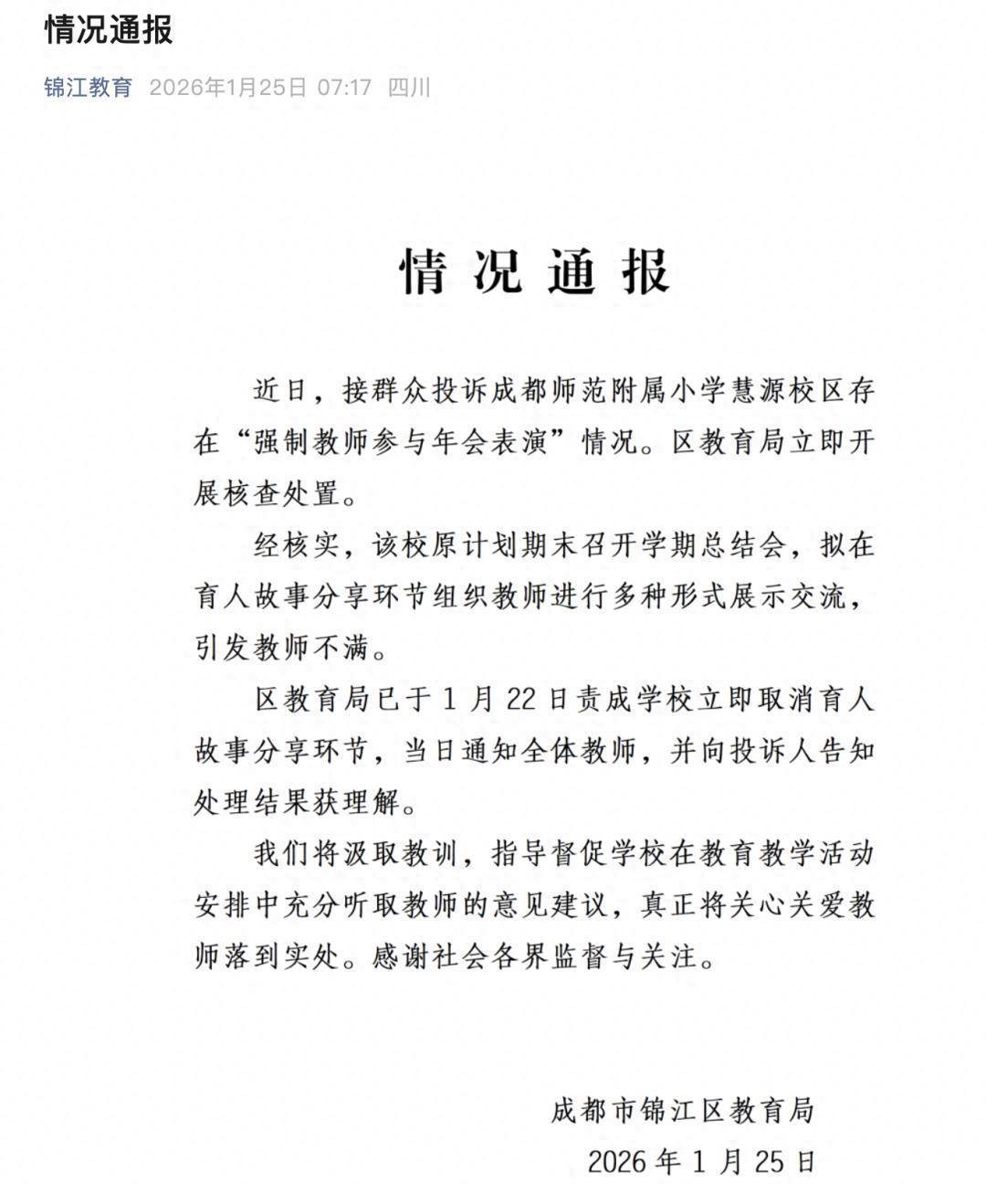 1月25日开yun体育网,成齐市锦江区训导局发布情况通报:近日,针对成齐师范附庸小学慧源校区存在“强制教师参与年会饰演”情况的投诉。锦江区训导局立即开展核查贬责。