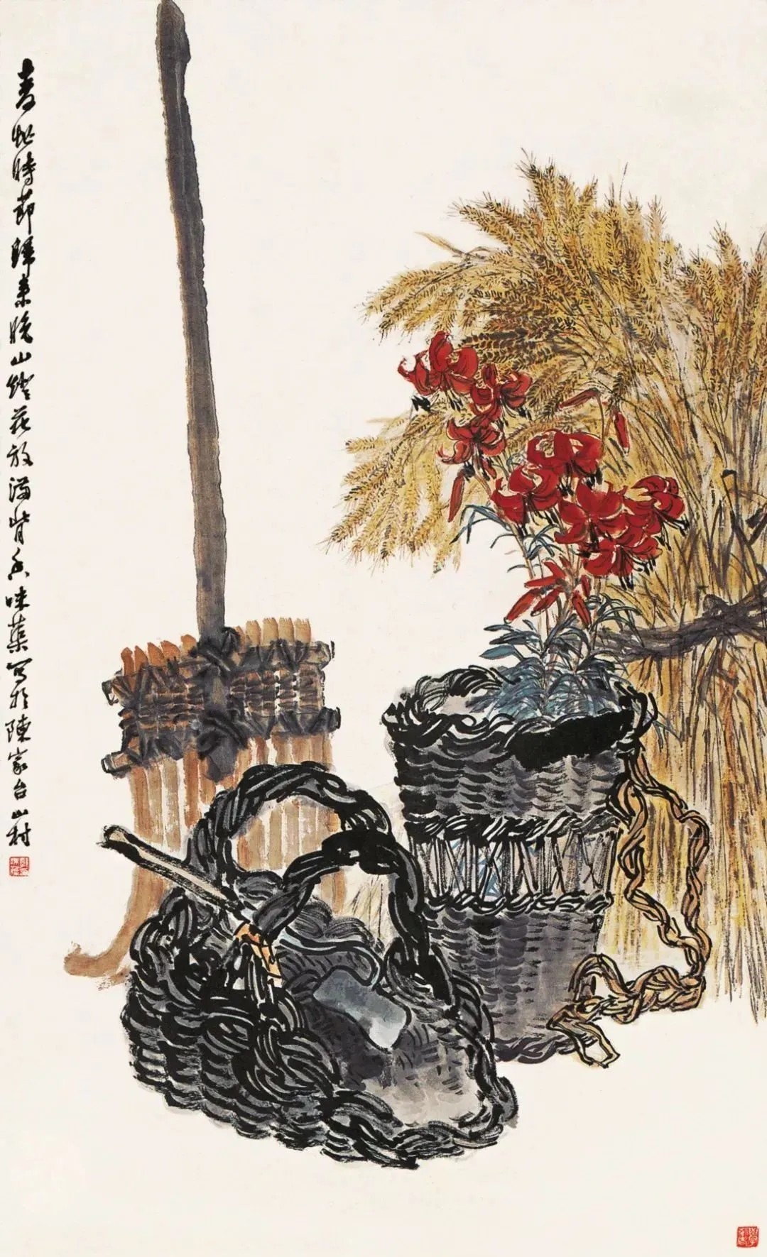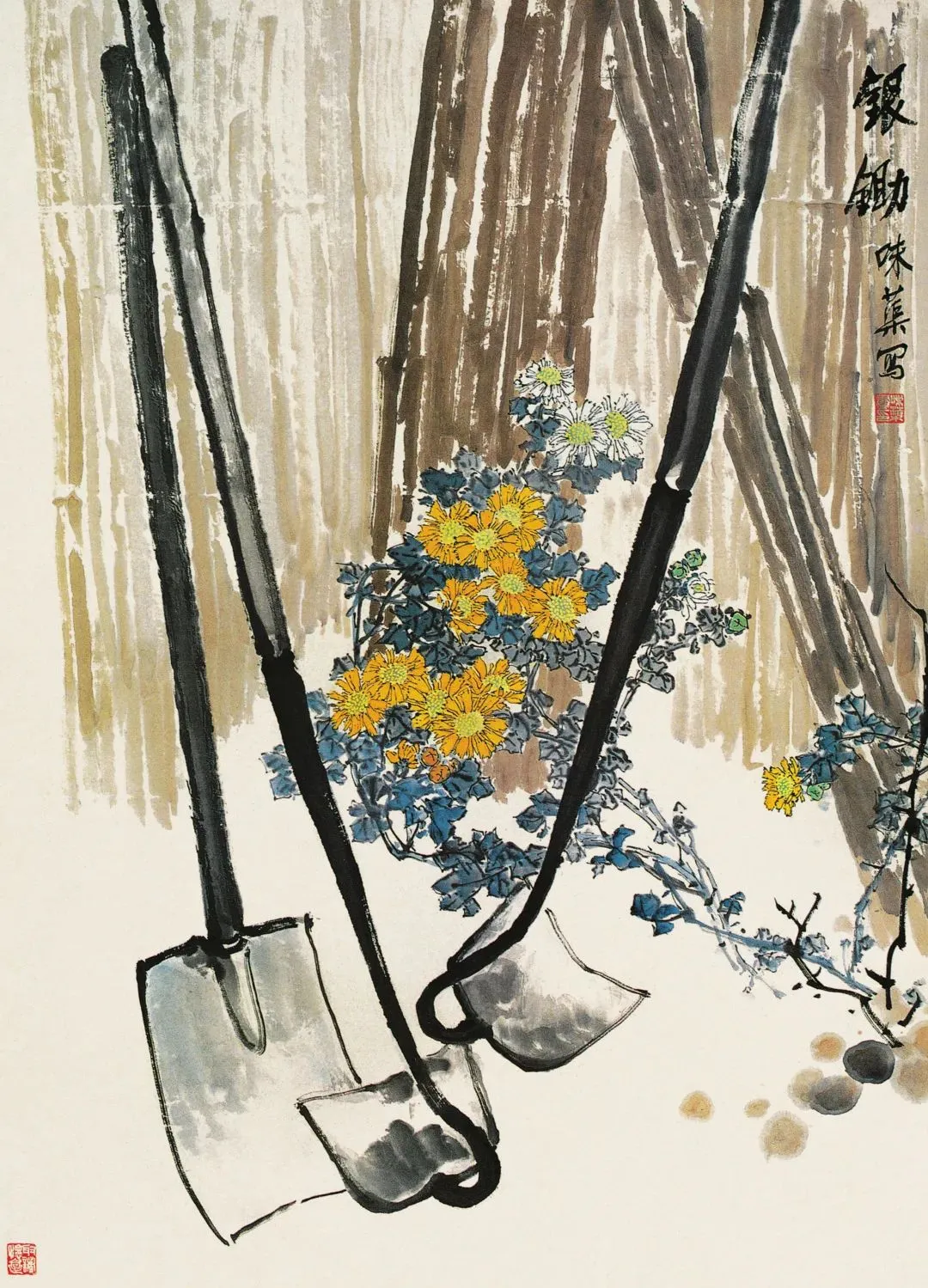 郭味蕖还爱用原色,石青、朱砂、藤黄,往画上一抹,清秀得很,但又不刺目。他画画,还妥贴个糊口吻味。耕具、瓜果、稻禾,啥王人往画里搬。你看那《银锄》,锄头泛着青光,控制花儿草儿陪着,就业的好意思,一下子就出来了。