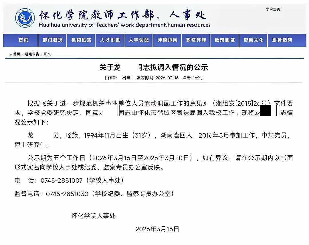 在怀化学院官方网站上,极目新闻记者查询发现,该校东说念主事处于3月16日发布了《对于龙某某同道拟调入情况的公示》,内部提到凭据《对于进一步轨范机关行状单元东说念主员流动调配使命的见识》(湘组发[2015]26号)文献条目,学校党委征询决定,容许龙某某同道由怀化市鹤城区轨则局调入该校使命。龙某某,男,瑶族,1994年11月出身(31岁),湖南隆回东说念主,2016年8月投入使命,中共党员,博士征询生。