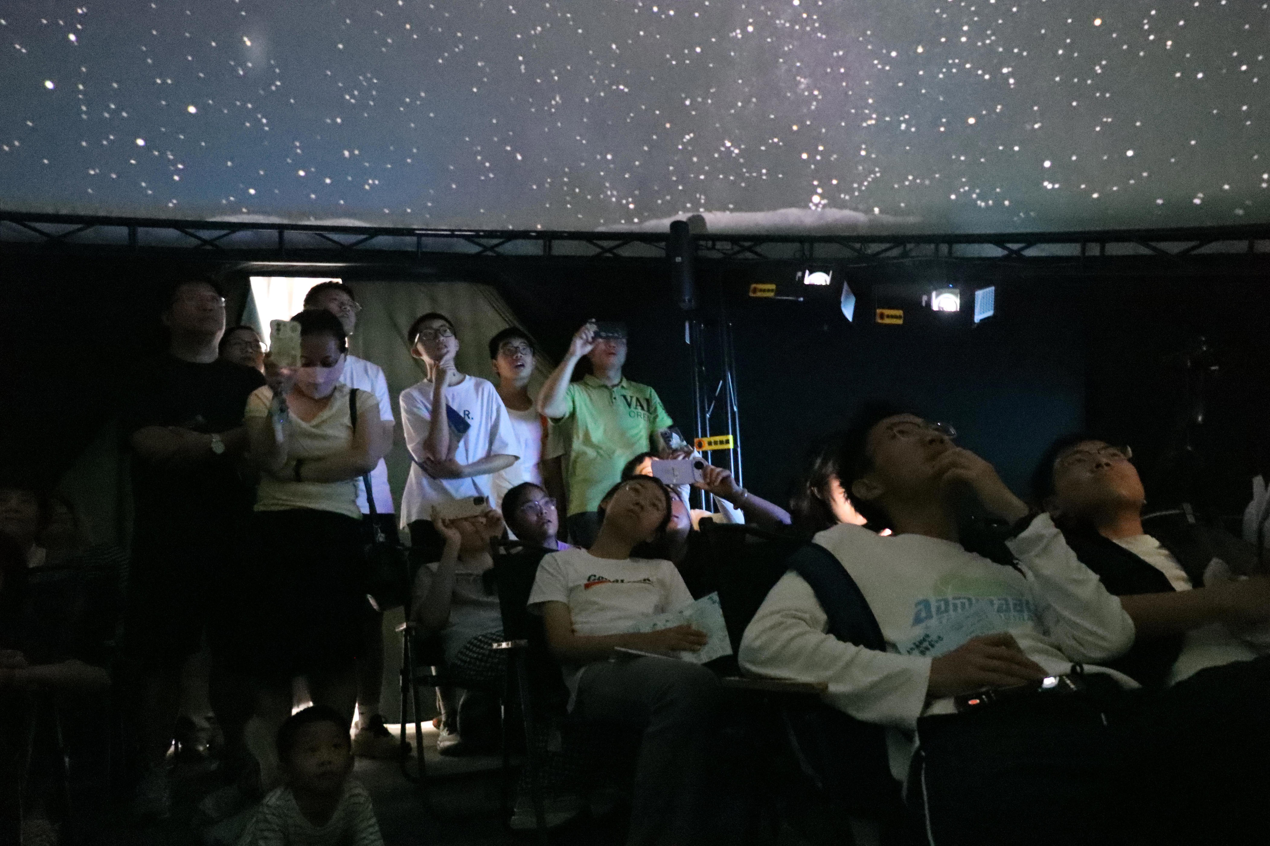 数字天象厅外大排长龙,大家皆想体验一把“躺着看星星”的悦目。当灯光灭火,穹顶星光亮起,各大星座逐渐现身,阐述员俏皮地告诉大家如何鉴识。